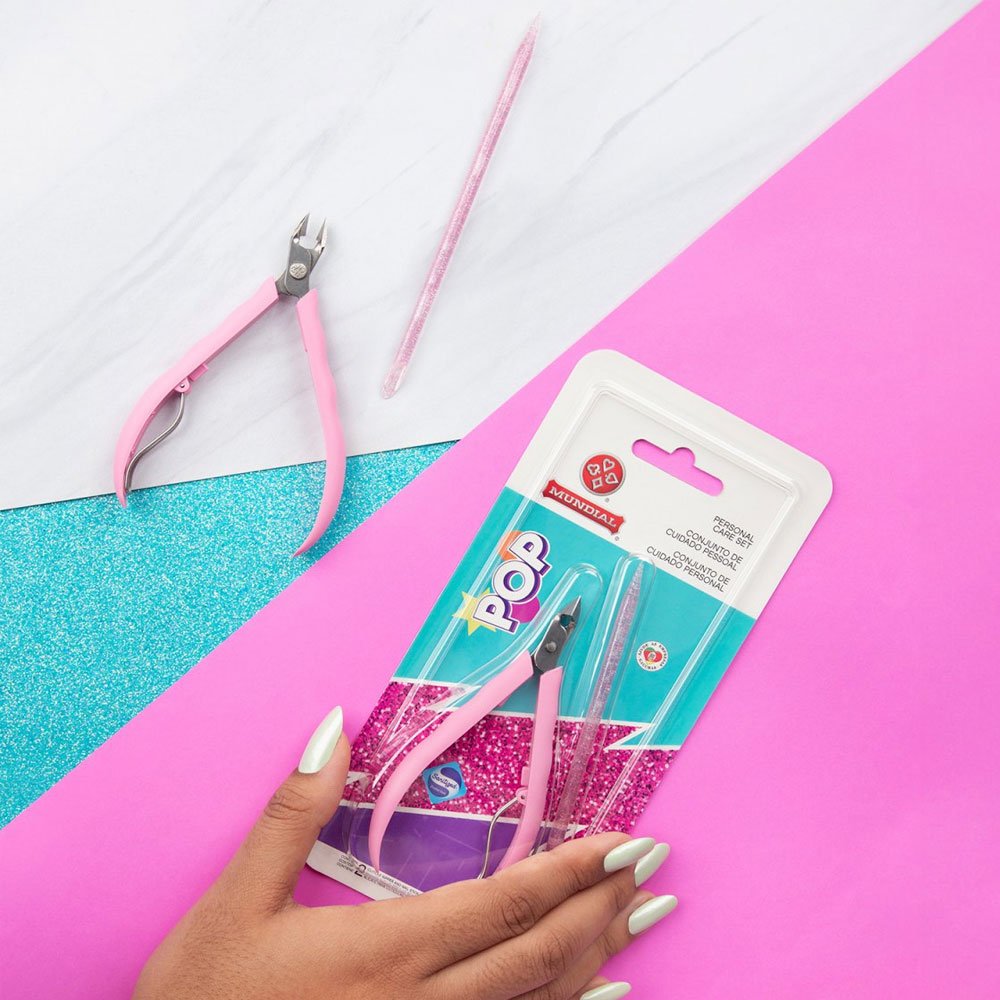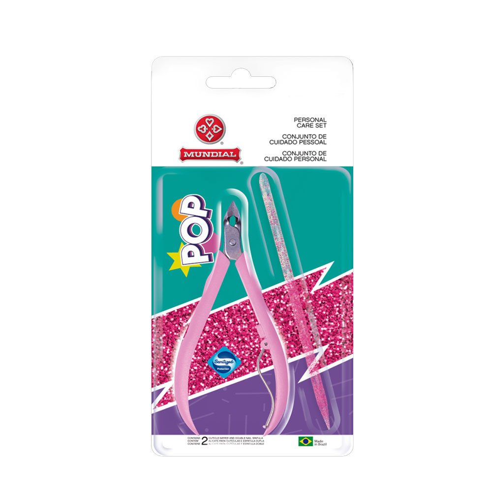 conjunto Mundial POP 751, é a mistura perfeita de beleza com qualidade. Conta com um palito duplo exclusivo em acrílico glitter, com uma ponta superfina em espiral que facilita a retirada do algodão e uma ponta chanfrada para empurrar cutículas e retirar esmalte em excesso. Disponível na cor rosa, o alicate possui cabos plásticos ergonômicos com proteção antimicrobial* para maior segurança durante o uso, lâminas afiadas e mola em aço inoxidável.