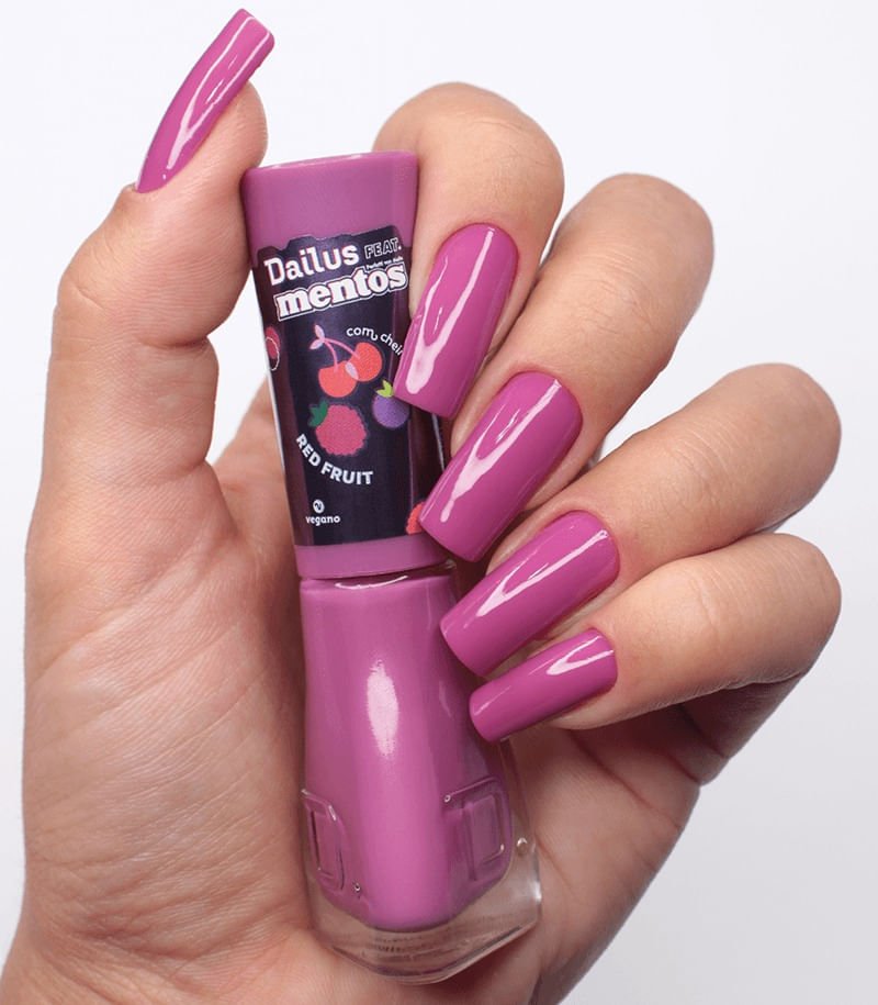 Para quem é fã da explosão de sabores que a balinha de frutas vermelhas entrega, este magenta da linha Dailus feat. Mentos é ideal. O Esmalte Dailus Mentos Red Fruit tem cheirinho de fruta, acabamento cremoso, brilho intenso, longa duração e secagem rápida.