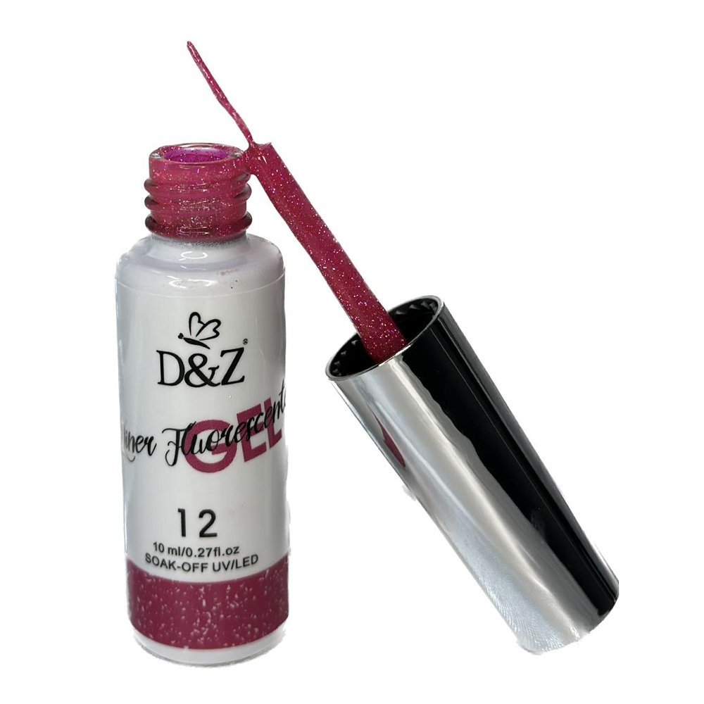 Esmalte em Gel para Desenho D&Z cor 12 Esmalte Em Gel Liner Fluorescente Com Glitter é a combinação de esmalte em gel decorativo com o pincel fino e brilho, faz com que este produto possa ser usado em salões profissionais, salões de beleza ou até mesmo em casa para uso pessoal.