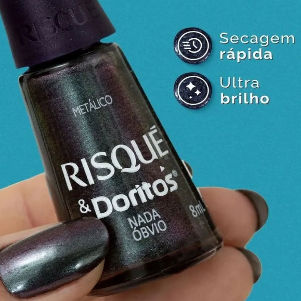 O nome já diz tudo: “Nada Óbvio”, o esmalte cinza metálico que é tudo menos comum! Inspirado no Doritos Sweet Chili, é perfeito para quem adora sair do convencional, suas unhas vão ultrapassar as expectativas e destacar sua personalidade única. Porque quando se trata de arrasar, você nunca escolhe o caminho óbvio!