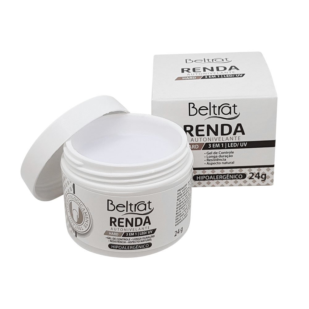 Gel Autonivelante para unhas - Beltrat Renda Hard 24g Descrição: Alongamento das unhas, Gel Construtor, Flexível, Longa Duração, Aspecto Natural, Confere a resistência característica das unhas de gel. Também utilizado para francesinha e decoração das unhas. Auto Nivelante Seca em cabines LED/UV. Produto dermatologicamente testado.