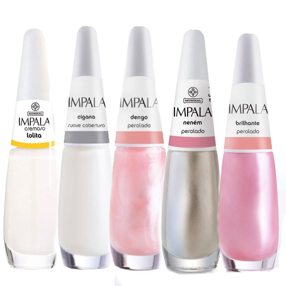 Kit 5 Esmaltes Impala O Kit contém: – Esmalte Impala Lolita Cremoso – Esmalte Impala Cigana Suave Cobertura – Esmalte Impala Neném Perolado – Esmalte Impala Brilhante Perolado – Esmalte Impala Dengo Perolado