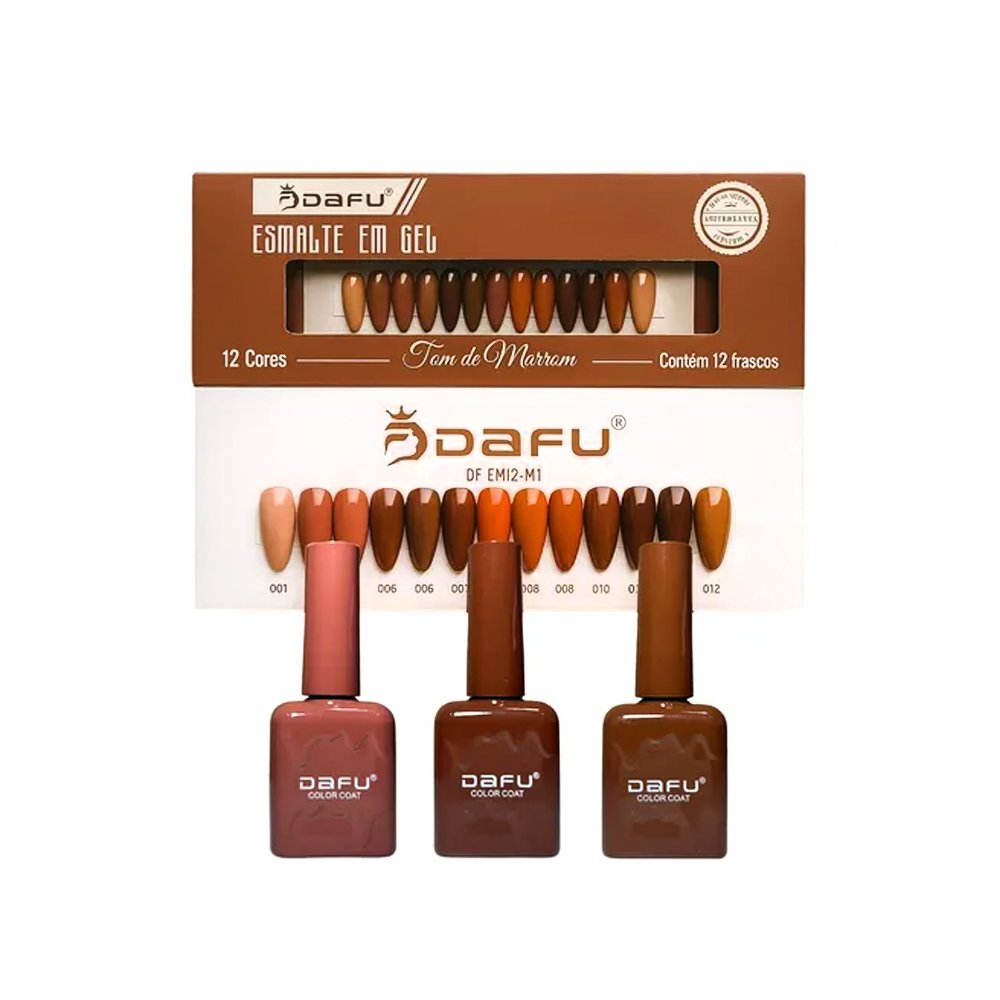 Kit Esmalte em Gel Dafu Tons de Marrom 12 unidades – Contém 12 cores tons de marrom – Cobertura perfeita;– Excelente fixação;– Tempo de catalização: 30-60 seg cada camada; Imagem Ilustrativa, as cores podem sofrer alteração.